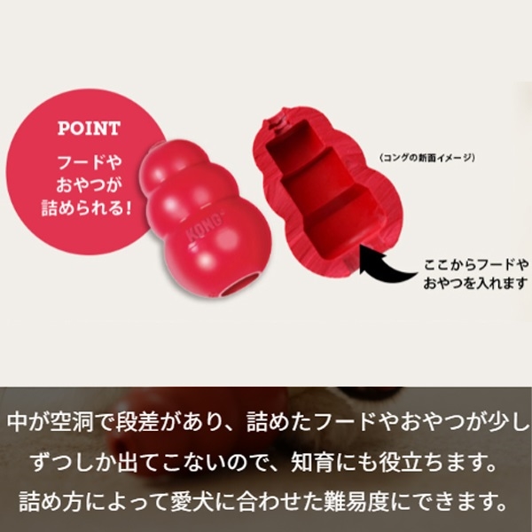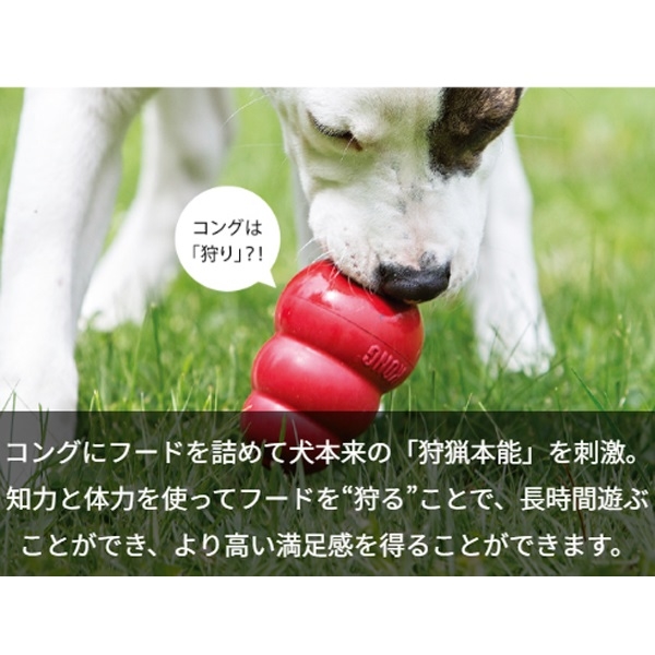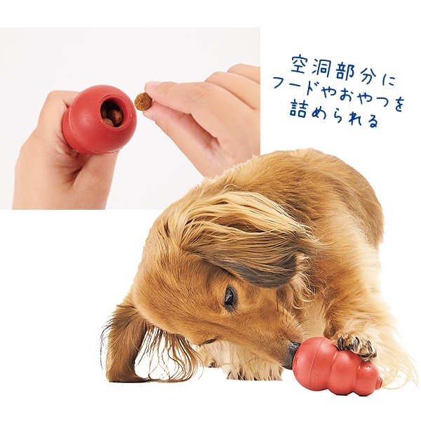 内側が空洞になっており、コング独自の凹凸に専用ペーストやフードを入れることで、犬が中身を取り出そうと夢中になります。