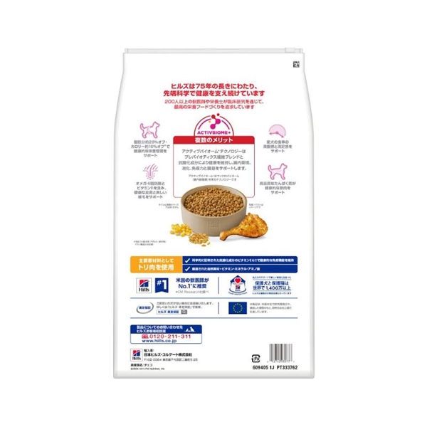 トリ肉(チキン、ターキー)、小麦、エンドウマメ、とうもろこし、とうもろこし蛋白、米、トリ肉エキス、セルロース、動物性油脂、ビートパルプ、植物性油脂、ポークエキス、亜麻仁、オーツ麦、フラクトオリゴ糖、トマト、柑橘類、ホウレンソウ、ミネラル類(カルシウム、ナトリウム、カリウム、クロライド、銅、鉄、マンガン、セレン、亜鉛、イオウ、ヨウ素)、乳酸、アミノ酸類(タウリン、リジン)、ビタミン類(A、B1、B2、B6、B12、C、D3、E、ベータカロテン、ナイアシン、パントテン酸、葉酸、ビオチン、コリン)、L-カルニチン、酸化防止剤(ミックストコフェロール、ローズマリー抽出物、緑茶抽出物)