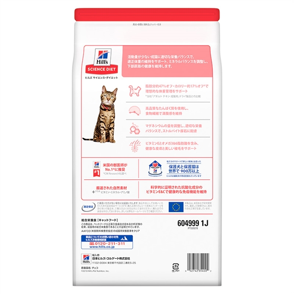 トリ肉(チキン、ターキー)、トウモロコシ、米、コーングルテン、動物性油脂、セルロース、ビートパルプ、エンドウマメ、チキンエキス、小麦、ミネラル類(カルシウム、ナトリウム、カリウム、クロライド、銅、鉄、マンガン、セレン、亜鉛、イオウ、ヨウ素)、乳酸、ビタミン類(A、B1、B2、B6、B12、C、D3、E、ベータカロテン、ナイアシン、パントテン酸、葉酸、ビオチン、コリン)、アミノ酸類(タウリン、メチオニン)、カルニチン、酸化防止剤(ミックストコフェロール、ローズマリー抽出物、緑茶抽出物)