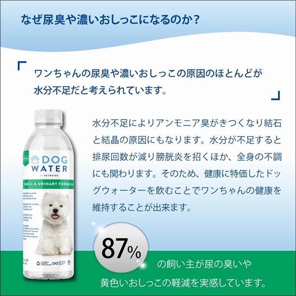 水分が不足すると排尿回数が減り膀胱炎を招くほか、全身の不調にも関わるため、健康に特価したドッグウォーターを飲むことでワンちゃんの健康を維持することが出来ます。