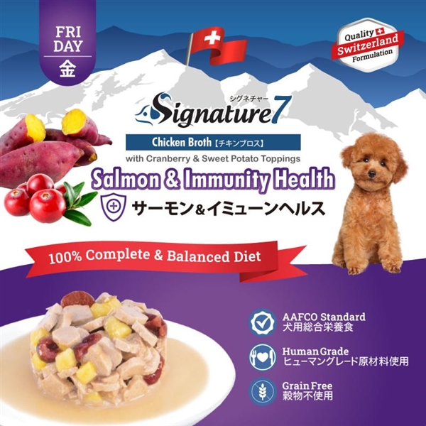 チキン、サーモン、クランベリー、さつまいも、ポテトスターチ、大豆油、ツナエキス、ビタミン類、ミネラル類、全卵粉、ピロリンNa、グアーガム、酸化チタン、タピオカ粉、カラメル色素、L-リジン、β-カロテン