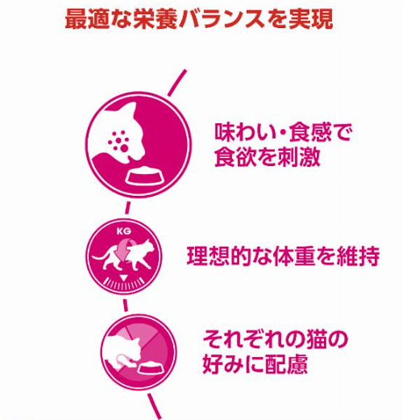 理想的な体重を維持できるよう最適なカロリー含有量に調整しているほか、猫それぞれの好みに配慮し、「アロマ・香り」「味わい・食感」「タンパク質含有量」といった異なるニーズに対応した製品展開を行っています。