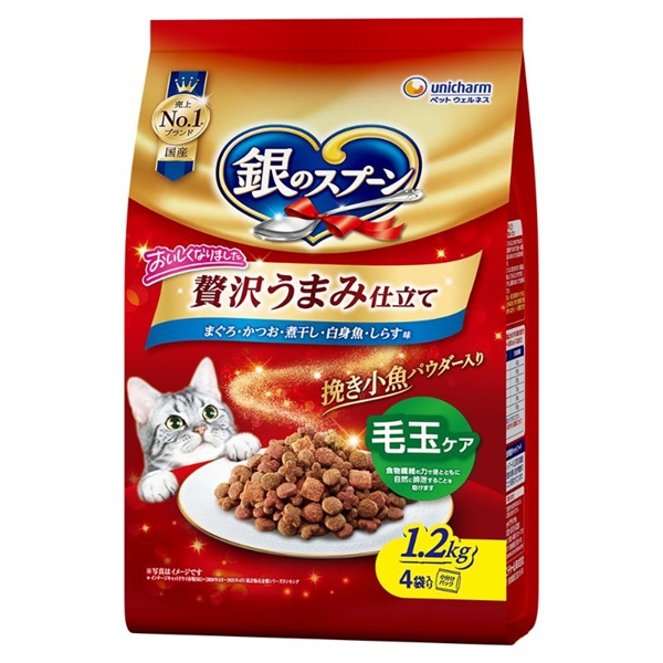 穀類(トウモロコシ、コーングルテンミール、パン粉、小麦粉)、肉類(チキンミール、ポークミール、ビーフミール、チキンエキス)、動物性油脂、魚介類(フィッシュミール、フィッシュエキス、煮干パウダー、かつお節、まぐろミール、かつおミール、白身魚ミール、乾燥シラス)、セルロースパウダー(食物繊維源)、野菜類(ビートパルプ)、酵母、酵母エキス、ミネラル類(カルシウム、塩素、コバルト、銅、鉄、ヨウ素、カリウム、マンガン、ナトリウム、リン、亜鉛)、調味料、ビタミン類(A、B1、B2、B6、B12、C、D、E、K、コリン、ナイアシン、パントテン酸、ビオチン、葉酸)、着色料(二酸化チタン、赤色102号、赤色106号、黄色4号、黄色5号)、アミノ酸類(タウリン)、酸化防止剤(ミックストコフェロール、ハーブエキス)