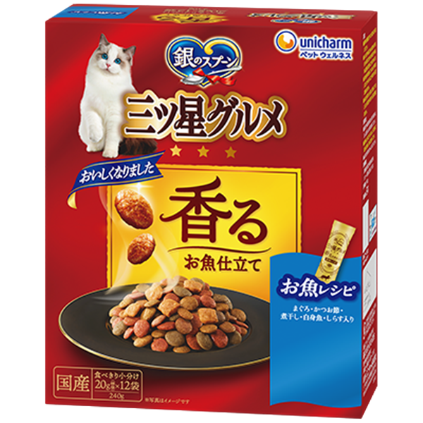 穀類(トウモロコシ、小麦粉、コーングルテンミール、パン粉)、肉類(チキンミール、ビーフミール、チキンエキス、ポークミール)、油脂類、魚介類(フィッシュミール、フィッシュエキス、まぐろミール、かつお節、煮干パウダー、白身魚ミール、乾燥シラス)、ビール酵母、酵母エキス、ミネラル類(カルシウム、塩素、コバルト、銅、鉄、ヨウ素、カリウム、マンガン、リン、亜鉛)、調味料、ビタミン類(A、B1、B2、B6、B12、C、D、E、K、コリン、ナイアシン、パントテン酸、ビオチン、葉酸)、着色料(二酸化チタン、赤色102号、赤色106号、黄色4号、黄色5号)、アミノ酸類(タウリン)、酸化防止剤(ミックストコフェロール、ハーブエキス)