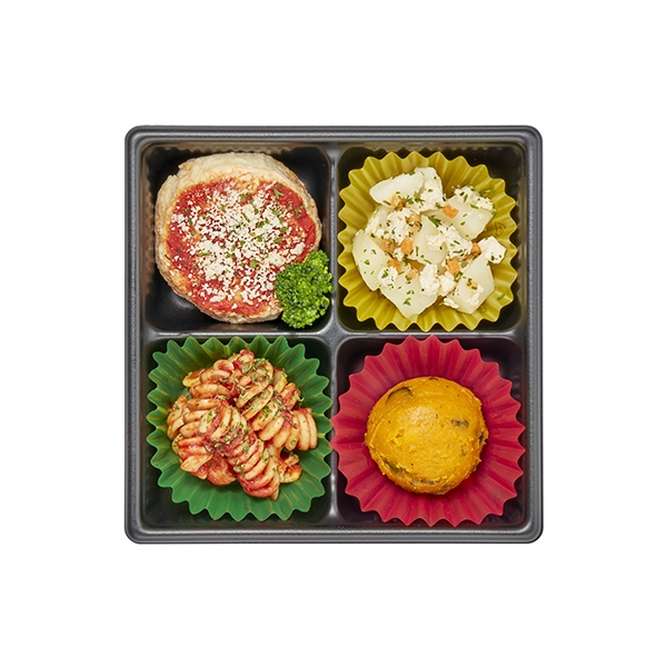 チキンピザ(鶏肉(国産)、卵、トマトピューレー、でん粉、プロセスチーズ、パセリ)、スイートパンプキン、ポテトとチキン(じゃがいも、鶏肉、人参、オリーブオイル)、トマトのパスタ(マカロニ、トマトピューレー)、ブロッコリー、パセリ/トレハロース、乳化剤、酸味料、(一部に卵・乳成分・小麦・鶏肉を含む)