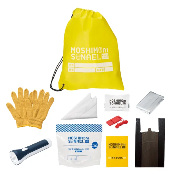 ライトやアルミシートなど、充実のセット内容。避難時に便利な不織布ナップサック入り。