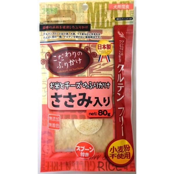 小麦・大麦・ライ麦などに含まれるたんぱく質の一種グルテンを使わず、お米とチーズで作ったアレルギーのワンちゃんも安心なグルテンフリーのふりかけです。