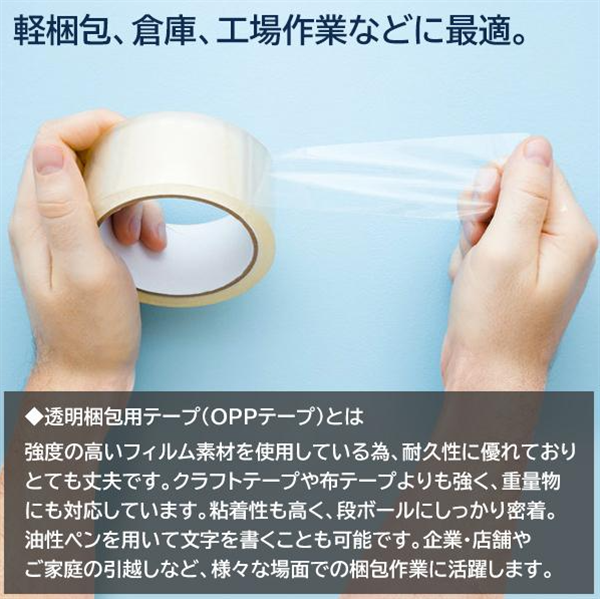 高い透明度と、薄くても高強度を兼ね備えた作業用透明OPPテープです。