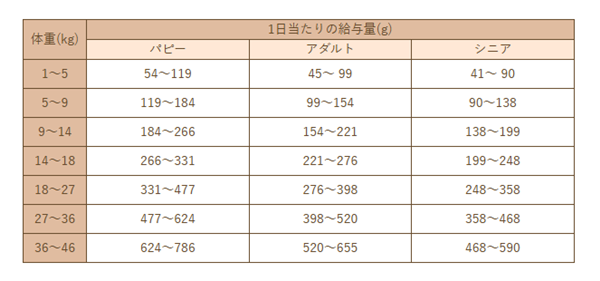 ・上記の表は標準給与量です。量は年齢、季節、犬種、運動量によって異なります。基本的には愛犬の体調に応じて与えてください。