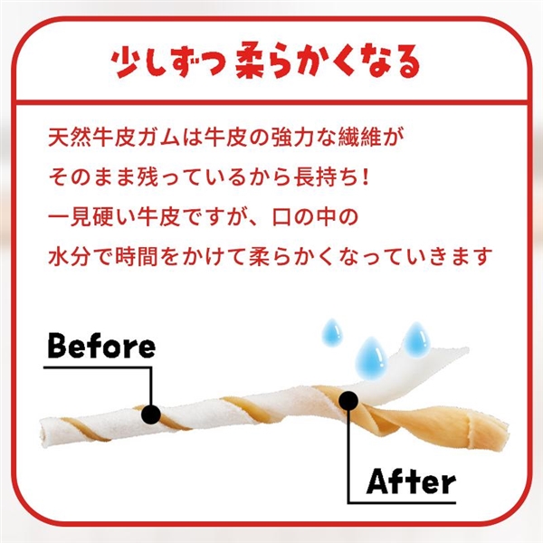 強力な繊維が残った天然牛皮を使用しているため長持ちし、噛むうちに口の中の水分でやわらかくなるため硬すぎません。