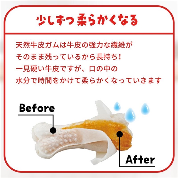 強力な繊維が残った天然牛皮を使用しているため噛み応えが長続きし、噛むうちに口の中の水分でやわらかくなるため硬すぎません。