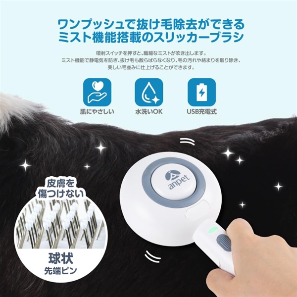 ミスト機能を搭載した、静電気を抑えながらブラッシングできるペット用スリッカーブラシです。