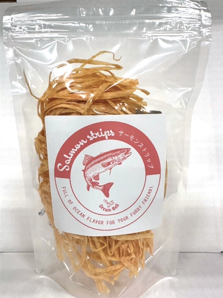 鮭皮のストリップで作られた、健康的で高たんぱくなおやつです。