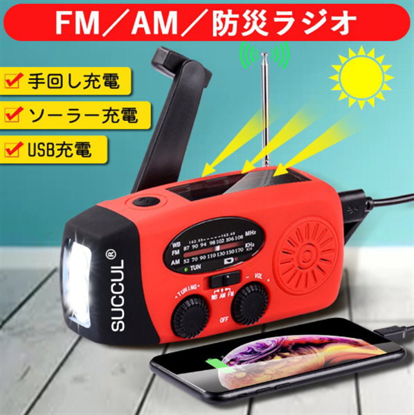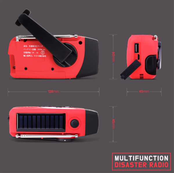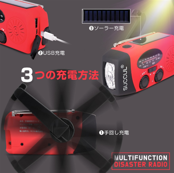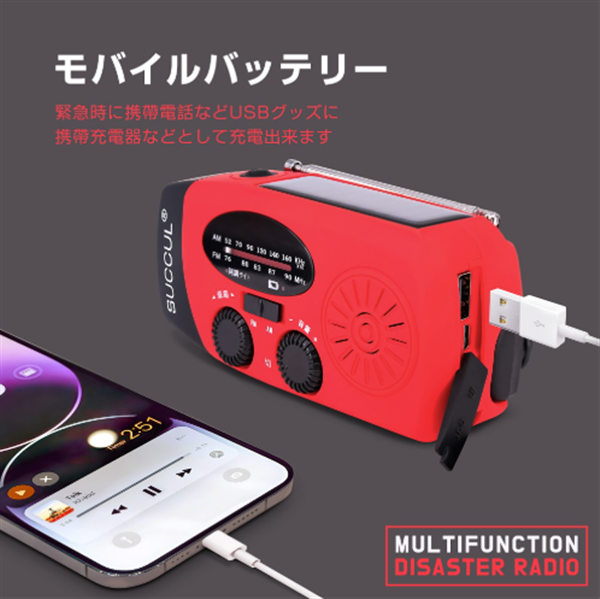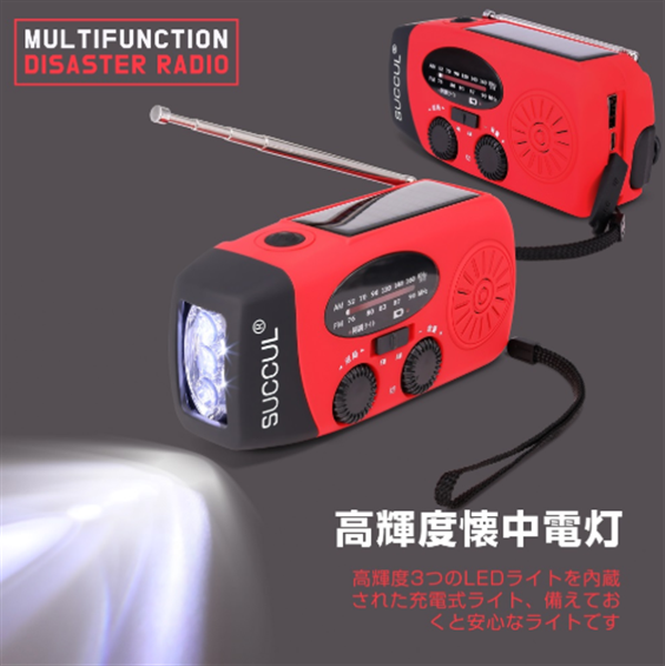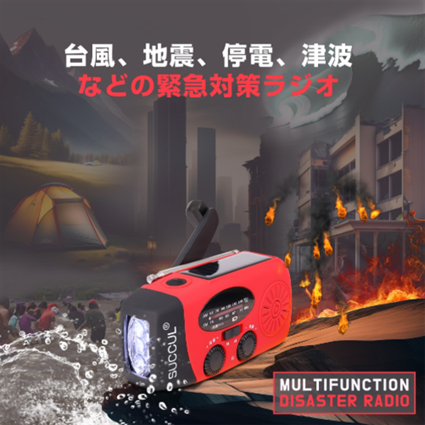 2000mAhの大容量バッテリー、防災懐中電灯、AM/FM対応、スマホ充電、3つの充電方式(手回し・ソーラー・USBなど)を備え、防災・キャンプ・緊急時に役立つ多機能モデルです。