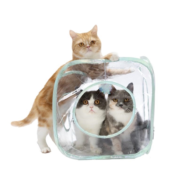 透明だけど、猫にとっては隠れ家気分で、猫同士でかくれんぼをしたり、通り抜けたり、気分に合わせて楽しめます。