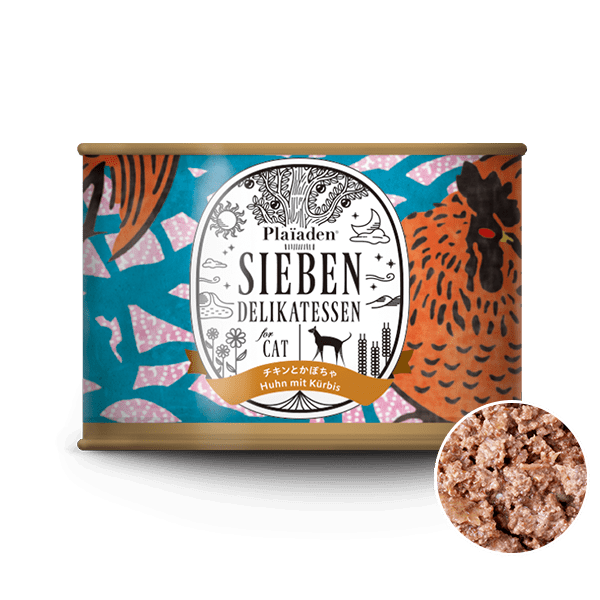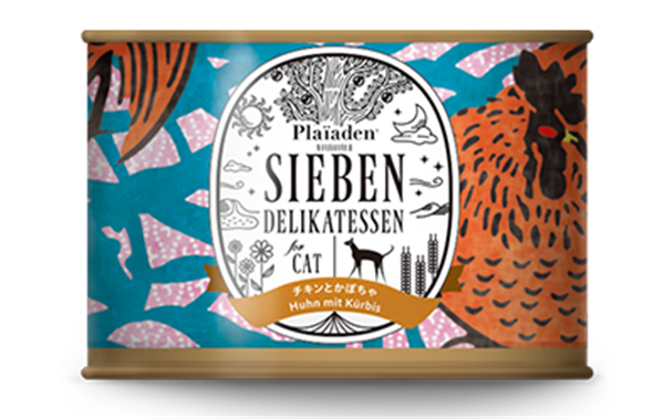 チキン 38.1%、チキンその他の部位 56.4%(肝臓、首、心臓、胃、皮)、カボチャ 3.5%、チアシード 1%、キャットニップ 0.5%、有機キクイモ 0.5% ※タウリン100mg(100gあたり)