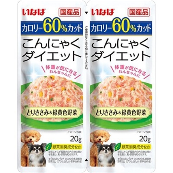 こんにゃく、鶏肉(ささみ)、野菜類(人参、かぼちゃ、グリンピース)、チキンエキスパウダー、寒天、酵母エキス、タンパク加水分解物、増粘安定剤(加工でん粉、増粘多糖類)、ビタミンE、紅麹色素、緑茶エキス