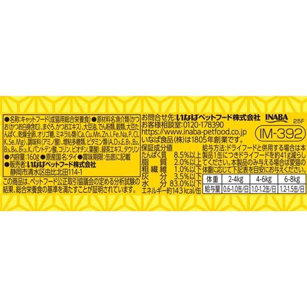 魚介類(かつお(かつお白身含む)、まぐろ、かつおエキス)、大豆油、でん粉類、穀類、大豆たんぱく、乾燥全卵、オリゴ糖、ミネラル類(Ca、Cu、Mn、Zn、I、Fe、Na、P、Cl、K、Se、Mg)、調味料(アミノ酸)、増粘多糖類、ビタミン類(A、D3、E、B1、B2、B3、B6、B12、K、パントテン酸、コリン、ビオチン、葉酸)、緑茶エキス、タウリン