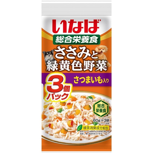 鶏肉(ささみ)、野菜類(人参、かぼちゃ、グリンピース)、さつまいも、大豆油、でん粉類、寒天、ミネラル類(Ca、Fe、Cu、Mn、Zn、I、K、P、Mg、Se)、増粘多糖類、ビタミン類(A、D3、E、B1、B2、B6、葉酸、B12、コリン、ビオチン)、紅麹色素、緑茶エキス