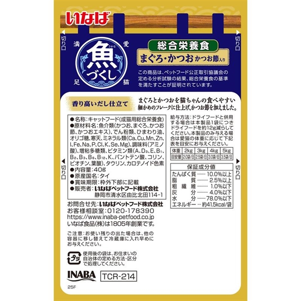 魚介類(かつお、まぐろ、かつお節、かつおエキス)、でん粉類、ひまわり油、オリゴ糖、寒天、ミネラル類(Ca、Cu、Mn、Zn、I、Fe、Na、P、Cl、K、Se、Mg)、調味料(アミノ酸)、増粘多糖類、ビタミン類(A、D3、E、B1、B2、B3、B6、B12、K、パントテン酸、コリン、ビオチン、葉酸)、タウリン、カロテノイド色素