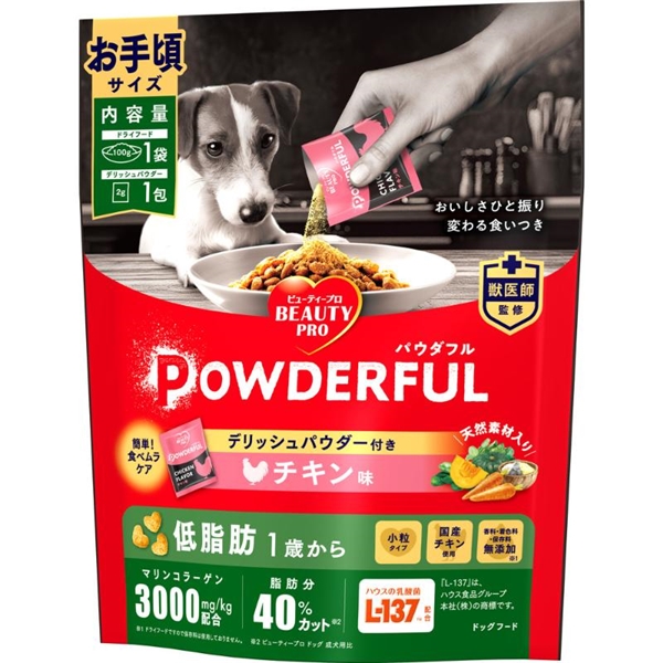 ・チキン味パウダー:肉類(チキンエキスパウダー、チキンレバーパウダー)、きな粉、野菜類(カボチャパウダー、コマツナパウダー、ニンジンパウダー、ホウレンソウパウダー)、穀物麹( 白米、大麦、赤米、玄米、 粟、 キビ、黒米 、タカキビ、ヒエ)、調味料