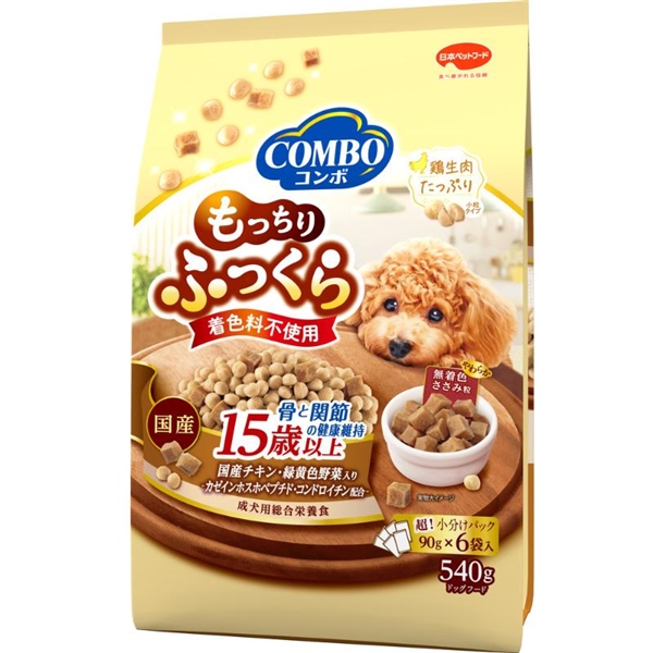 穀類(小麦粉、コーンフラワー、小麦グルテン)、大豆たんぱく、糖類(ショ糖、オリゴ糖)、肉類(国産鶏肉、国産鶏レバー、国産鶏ササミ、ビーフ)、牛コラーゲン、動物性油脂、サツマイモ、食塩、セレン酵母、カゼインホスホペプチド、野菜類(トマト、ニンジン、ホウレンソウ)、小魚粉末、チーズ、コエンザイムQ10、プロピレングリコール、ミネラル類(カルシウム、リン、ナトリウム、クロライド、銅、マンガン、亜鉛、ヨウ素、コバルト)、ソルビトール、加工デンプン、グリセリン、保存料(ソルビン酸カリウム、デヒドロ酢酸ナトリウム)、膨張剤、ポリリン酸ナトリウム、酸味料(クエン酸、リンゴ酸)、メチオニン、香料、ビタミン類(A、B1、B2、B12、D、E、コリン)、pH調整剤、酸化防止剤(エリソルビン酸ナトリウム)、発色剤(亜硝酸ナトリウム)、グルコサミン、コンドロイチン