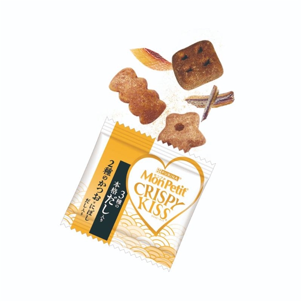 白身魚、チキン、米、チキンミール、牛脂、えんどう豆でんぷん、大麦、とうもろこしたんぱく、たんぱく加水分解物、キャッサバ粉、かつおだしパウダー、小魚(にぼし)、モルトエキス、かつお節、ぶどう糖、酵母、ツナパウダー、えびパウダー、かにパウダー、ミネラル類(カルシウム、カリウム、ナトリウム、クロライド、鉄、銅、マンガン、亜鉛、ヨウ素、セレン)、酸味料、アミノ酸類(グリシン、タウリン)、ビタミン類(A、D、E、K、B1、B2、パントテン酸、ナイアシン、B6、葉酸、ビオチン、B12、コリン、C)、着色料(食用赤色40号、食用青色2号、食用黄色4号、食用黄色5号)、酸化防止剤(ブチルヒドロキシアニソール、ジブチルヒドロキシトルエン、ミックストコフェロール)