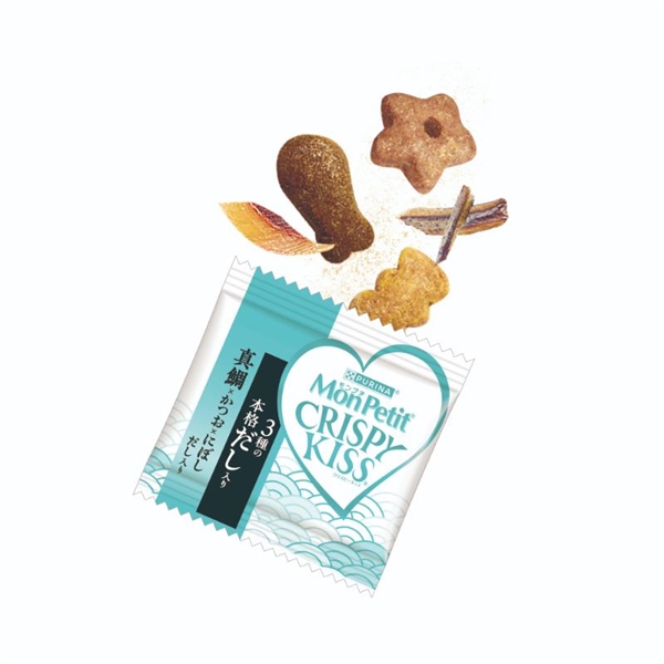 白身魚、チキン、米、チキンミール、牛脂、えんどう豆でんぷん、とうもろこしたんぱく、大麦、たんぱく加水分解物、酵母、キャッサバ粉、かつおだしパウダー、小魚(にぼし)、モルトエキス、かつお節、ぶどう糖、サーモンパウダー、えびパウダー、真鯛だしパウダー、ミネラル類(カルシウム、カリウム、ナトリウム、クロライド、鉄、銅、マンガン、亜鉛、ヨウ素、セレン)、酸味料、アミノ酸類(グリシン、タウリン)、ビタミン類(A、D、E、K、B1、B2、パントテン酸、ナイアシン、B6、葉酸、ビオチン、B12、コリン、C)、着色料(食用赤色40号、食用青色2号、食用黄色4号、食用黄色5号)、酸化防止剤(ブチルヒドロキシアニソール、ジブチルヒドロキシトルエン、ミックストコフェロール)