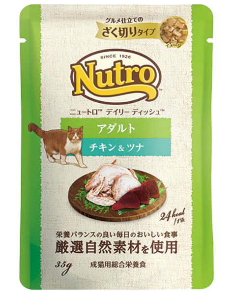 チキン、ツナ、ビーフレバー、鶏レバー、小麦、調味料(アミノ酸等)、ビタミン類(B1、B2、B6、B12、E、K、コリン、ナイアシン、パントテン酸、ビオチン、葉酸)、ミネラル類(Ca、Cl、Cu、Fe、I、K、Mg、Mn、Na、P、Zn)、タウリン、増粘多糖類