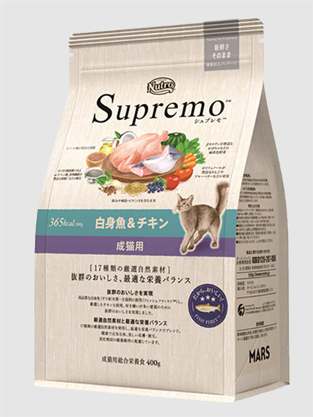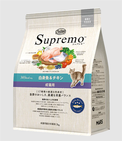 白身魚(すり身)、チキンミール、エンドウタンパク、大麦*2、玄米*3、エンドウマメ*2*4、鶏脂*1*5、ビートパルプ*2、モロコシ、チキン(肉)、タンパク加水分解物、亜麻仁*2*6、チアシード*2*6*7、ココナッツ*8、トマト*7、乾燥卵、パンプキン*7、ケール*7、ホウレン草*7*9、ブルーベリー*7、リンゴ*7、ニンジン*7、ビタミン類(A、B1、B2、B6、B12、C、D3、E、コリン、ナイアシン、パントテン酸、ビオチン、葉酸)、ミネラル類(亜鉛、カリウム、カルシウム、クロライド、セレン、ヨウ素、鉄、銅)、アミノ酸類(タウリン)、酸化防止剤(ミックストコフェロール、ローズマリー抽出物、クエン酸)*1ミックストコフェロールで保存*2食物繊維含、*3鉄分、亜鉛、ビタミンE含、*4ビタミンB1含、*5リノール酸含、*6α-リノレン酸、*7抗酸化成分含、*8中鎖脂肪酸、カリウム含、*9鉄分含