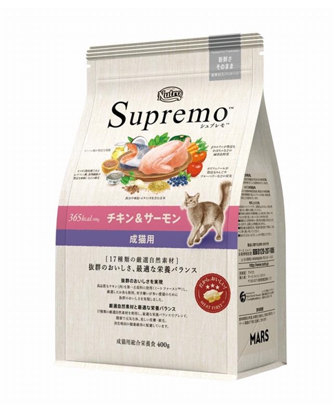 チキン(肉)、チキンミール、エンドウマメ*2*3、大麦*3、玄米*4、サーモン(すり身)*5、エンドウタンパク、ビートパルプ*3、タンパク加水分解物、鶏脂*1*6、亜麻仁*3*7、チアシード*3*7*8、ココナッツ*9、トマト*8、乾燥卵、パンプキン*8、ケール*8、ホウレン草*8*10、ブルーベリー*8、リンゴ*8、ニンジン*8、ビタミン類(A、B1、B2、B6、B12、C、D3、E、コリン、ナイアシン、パントテン酸、ビオチン、葉酸)、ミネラル類(カリウム、カルシウム、クロライド、セレン、ナトリウム、マンガン、ヨウ素、亜鉛、鉄、銅)、アミノ酸類(タウリン)、酸化防止剤(ミックストコフェロール、ローズマリー抽出物、クエン酸)*1ミックストコフェロールで保存*2ビタミンB1含、*3食物繊維含、*4鉄分、亜鉛、ビタミンE含、*5DHA、EPA含、*6リノール酸含、*7α-リノレン酸、*8抗酸化成分含、*9中鎖脂肪酸、カリウム含、*10鉄分含