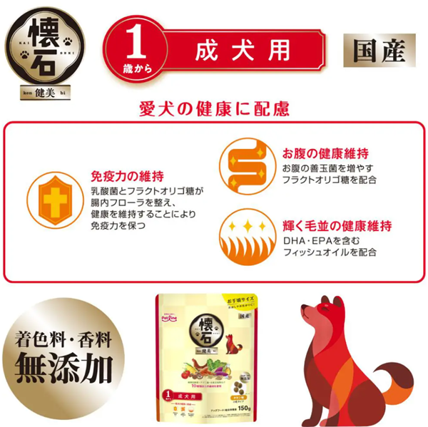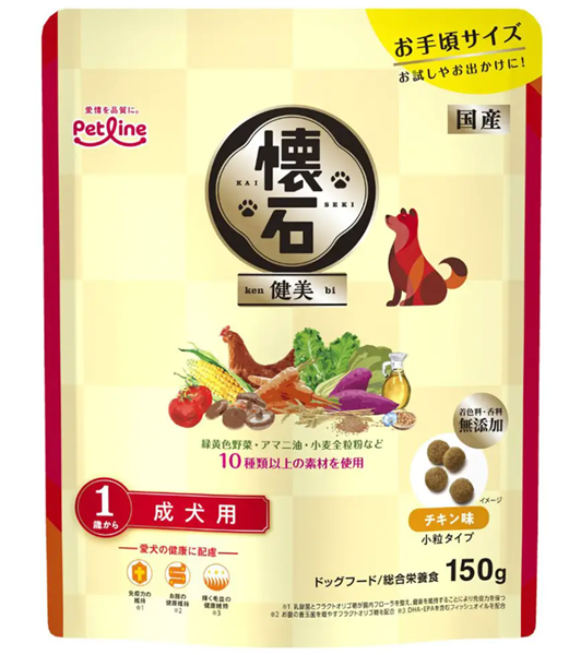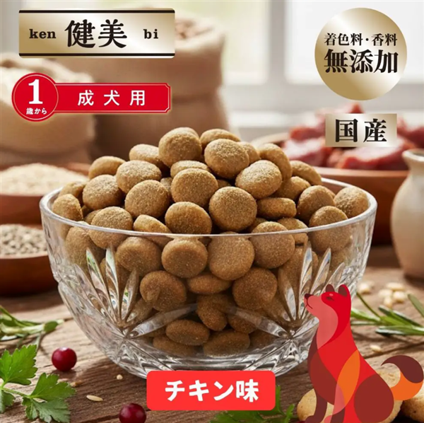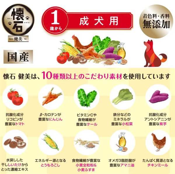 穀類(コーングルテンフィード、小麦粉、コーングルテンミール、米粉、とうもろこし、小麦全粒粉、小麦ふすま)、肉類(チキンミール、ミートミール、チキンレバーパウダー)、油脂類(動物性油脂、フィッシュオイル:DHA・EPA源、アマニ油)、ビートパルプ、糖類(フラクトオリゴ糖)、野菜類(にんじんパウダー、ケールパウダー、トマトパウダー、小松菜パウダー)、いも類(紫芋パウダー)、きのこ類(しいたけエキスパウダー)、乳酸菌、セレン酵母、ビタミン類(A、D3、E、K3、B1、B2、パントテン酸、ナイアシン、B6、葉酸、ビオチン、B12、コリン)、ミネラル類(カルシウム、ナトリウム、カリウム、塩素、鉄、コバルト、銅、マンガン、亜鉛アミノ酸複合体、亜鉛、ヨウ素)、アミノ酸類(メチオニン)、甘味料(キシロース)、酸化防止剤(ローズマリー抽出物、ミックストコフェロール)、調味料