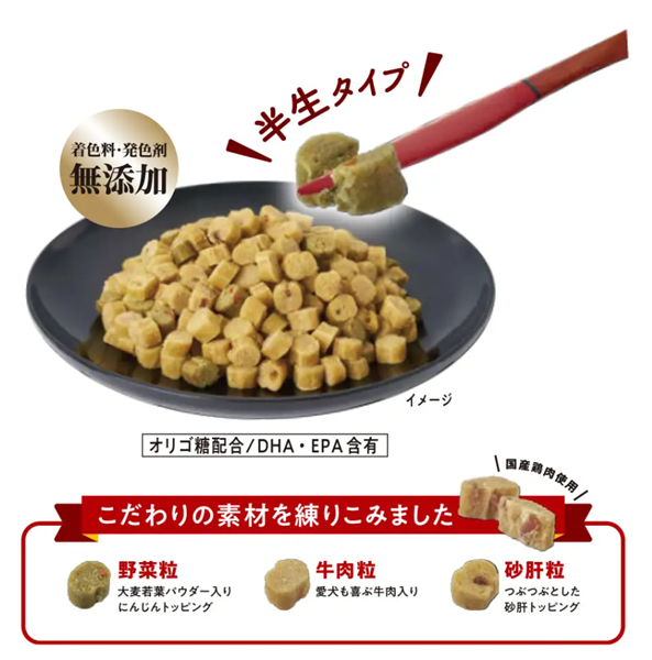 穀類(小麦粉、小麦グルテン)、肉類(鶏肉、砂肝、牛肉、鶏ささみ)、豆類(脱脂大豆)、糖類(砂糖、オリゴ糖)、油脂類(動物性油脂、植物性油脂、フィッシュオイル:DHA・EPA源、アマニ油)、野菜類(にんじんパウダー、大麦若葉パウダー)、ビール酵母、プロピレングリコール、グリセリン、リン酸塩(Na)、セレン酵母、ビタミン類(A、D3、E、B1、B2、パントテン酸、ナイアシン、B6、葉酸、B12、コリン、イノシトール)、ミネラル類(カルシウム、リン、ナトリウム、塩素、鉄、銅、亜鉛、ヨウ素)、保存料(ソルビン酸カリウム)、酸化防止剤(ビタミンC)、膨張剤