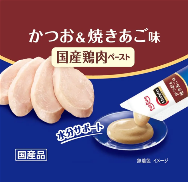 国産鶏肉と焼きあごパウダーをベースに、まぐろ・かつお・ささみの3種の味で、おいしい時間と健康ケアを同時に叶える、国産鶏肉ペーストおやつです。