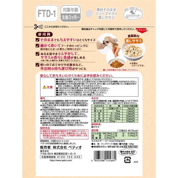 細かく砕いてフードのトッピングに、ふやかして素材の香りと食感を楽しめる、軽いのでおでかけやお散歩など外出時の持ち運び用おやつに・・・様々な目的に合わせてアレンジできる。