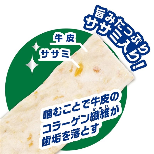 コラーゲン繊維豊富な天然牛皮に低脂肪・良質たん白質豊富で旨味たっぷりなササミを練りこみ、さらにササミ粒を入れることでおいしくデンタルケア。