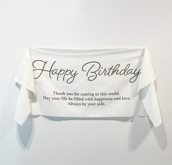 壁に貼り付けるタペストリーで、HAPPY BIRTHDAYの文字も愛犬のとびきりの笑顔も、しっかり写せる絶妙なサイズにこだわりました。