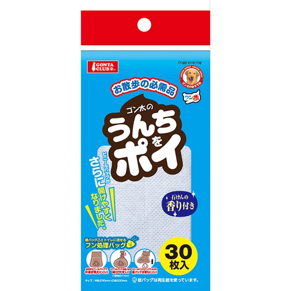 紙バッグごとトイレに流せるフン処理バッグです。お散歩時のマナーアップとしてご利用ください。