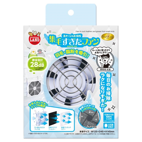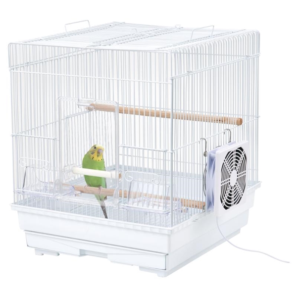 フックで引っ掛けるだけで、ケージ内に舞う羽毛や脂粉をしっかり吸引。お掃除の手間が省けるファンです。