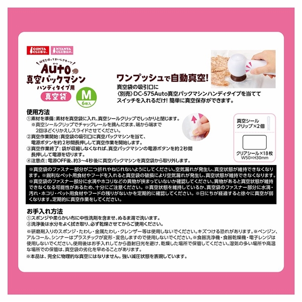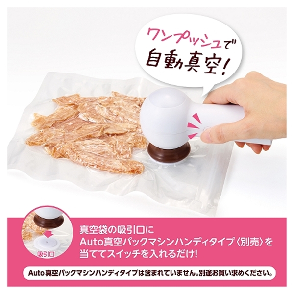この真空袋はハンディタイプの真空パックマシン(別売)と組み合わせて使用し、ワンプッシュで簡単に真空保存ができます。
