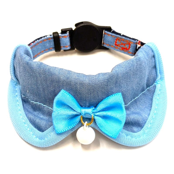 ・表はデニム地、裏はペイズリー柄のコットン製生地を使用した、大きな襟についた猫用首輪です。