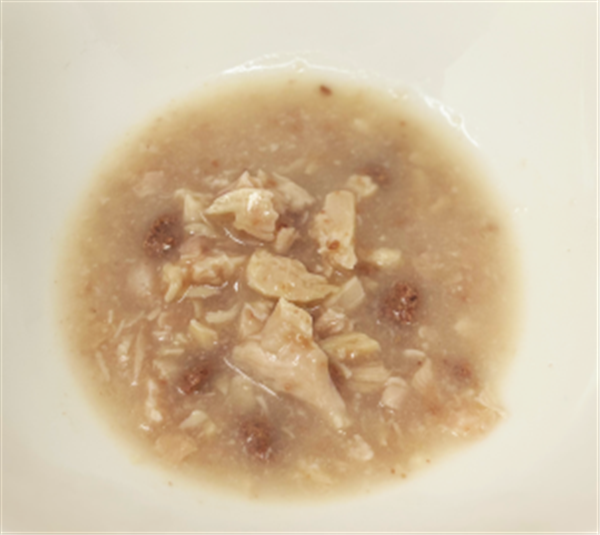 肉類(鶏胸肉、鶏レバー、鶏ささみ)、鶏スープ、酵母エキス、魚油(DHA・EPA源)、クランベリーパウダー(プロアントシアニジン源)、セレン酵母、増粘多糖類