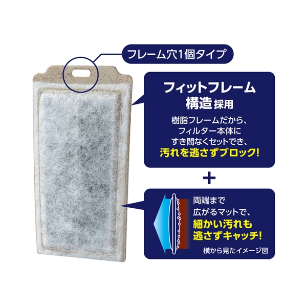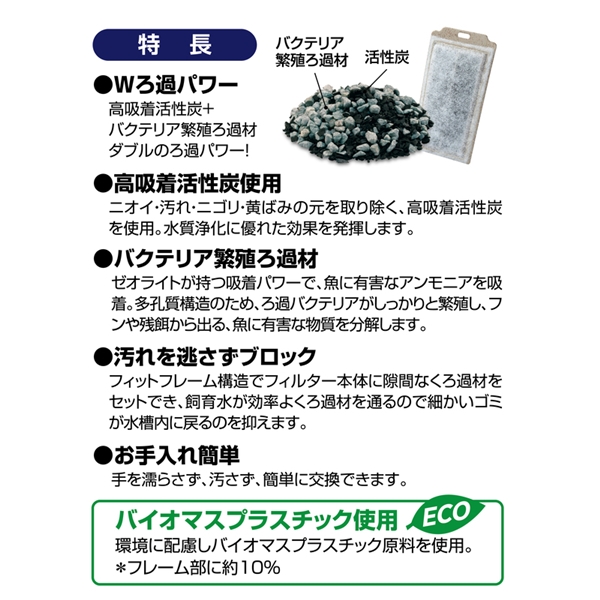 フィットフレーム構造でフィルター本体に隙間なくろ過材をセットでき、飼育水が効率よくろ過材を通るので細かいゴミが水槽内に戻るのを抑えます。