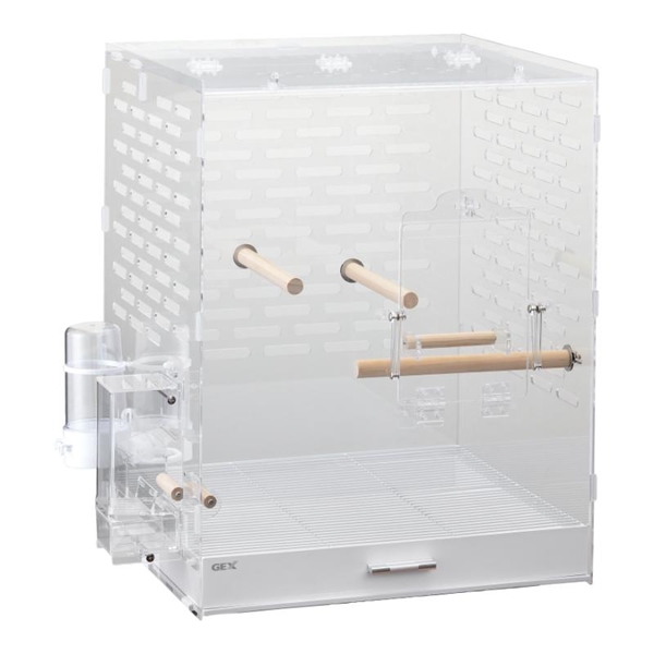 全面クリアでかわいい姿がよく見えるアクリル製バードケージです。