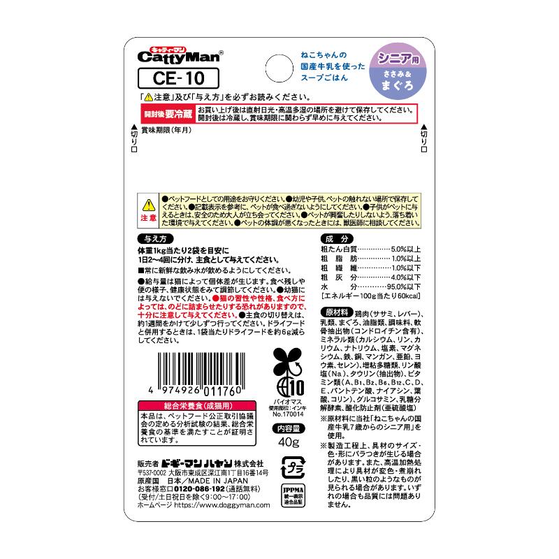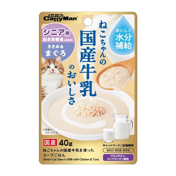 鶏肉(ササミ、レバー)、乳類(ねこちゃんの国産牛乳7歳からのシニア用等)、まぐろ、油脂類、調味料、魚軟骨抽出物(コンドロイチン含有)、ミネラル類(カルシウム、リン、カリウム、ナトリウム、塩素、マグネシウム、鉄、銅、マンガン、亜鉛、ヨウ素、セレン)、増粘多糖類、リン酸塩(Na)、タウリン(抽出物)、ビタミン類(A、B1、B2、B6、B12、C、D、E、パントテン酸、ナイアシン、葉酸、コリン)、グルコサミン