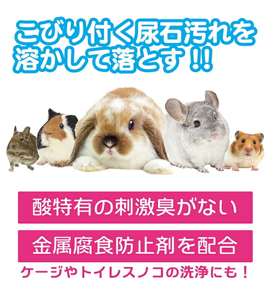 頑固な尿石を溶かしてスッキリトイレやケージにこびり付いてニオイの元になる尿石汚れを、パワフルに分解して素早く除去します!