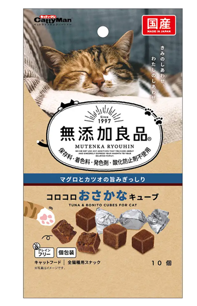 主原料にマグロとカツオだけを使用し、香りと味わいをキューブ形状にギュッと凝縮した猫用おやつです。