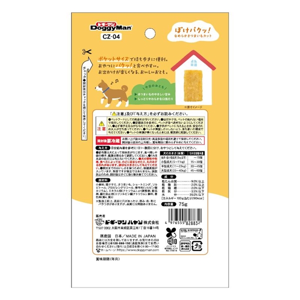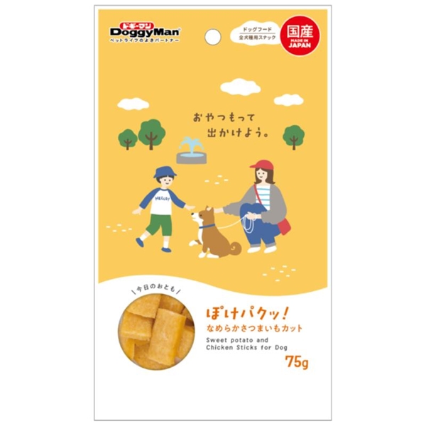 小麦粉、鶏ササミ、さつまいも、ショートニング、ソルビトール、プロピレングリコール、保存料(ソルビン酸カリウム)、ミネラル類(ナトリウム)、pH調整剤、膨張剤、酸化防止剤(エリソルビン酸ナトリウム)、香料、着色料(黄4、黄5)
