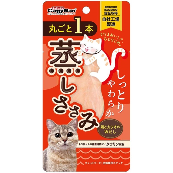 猫ちゃんが大好きな鶏ササミを贅沢に一本使用し、おいしく手軽に食べられるように、しっとりとしたやわらかさに蒸しあげました。