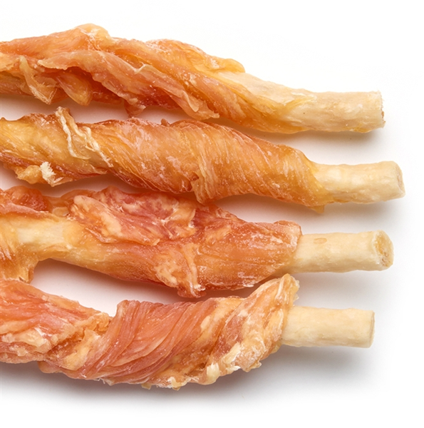 ハードな食感に仕上げた鶏ササミを、牛すじを使用したしなやかさのあるソフトガムに巻きつけたハード&ソフトタイプ。